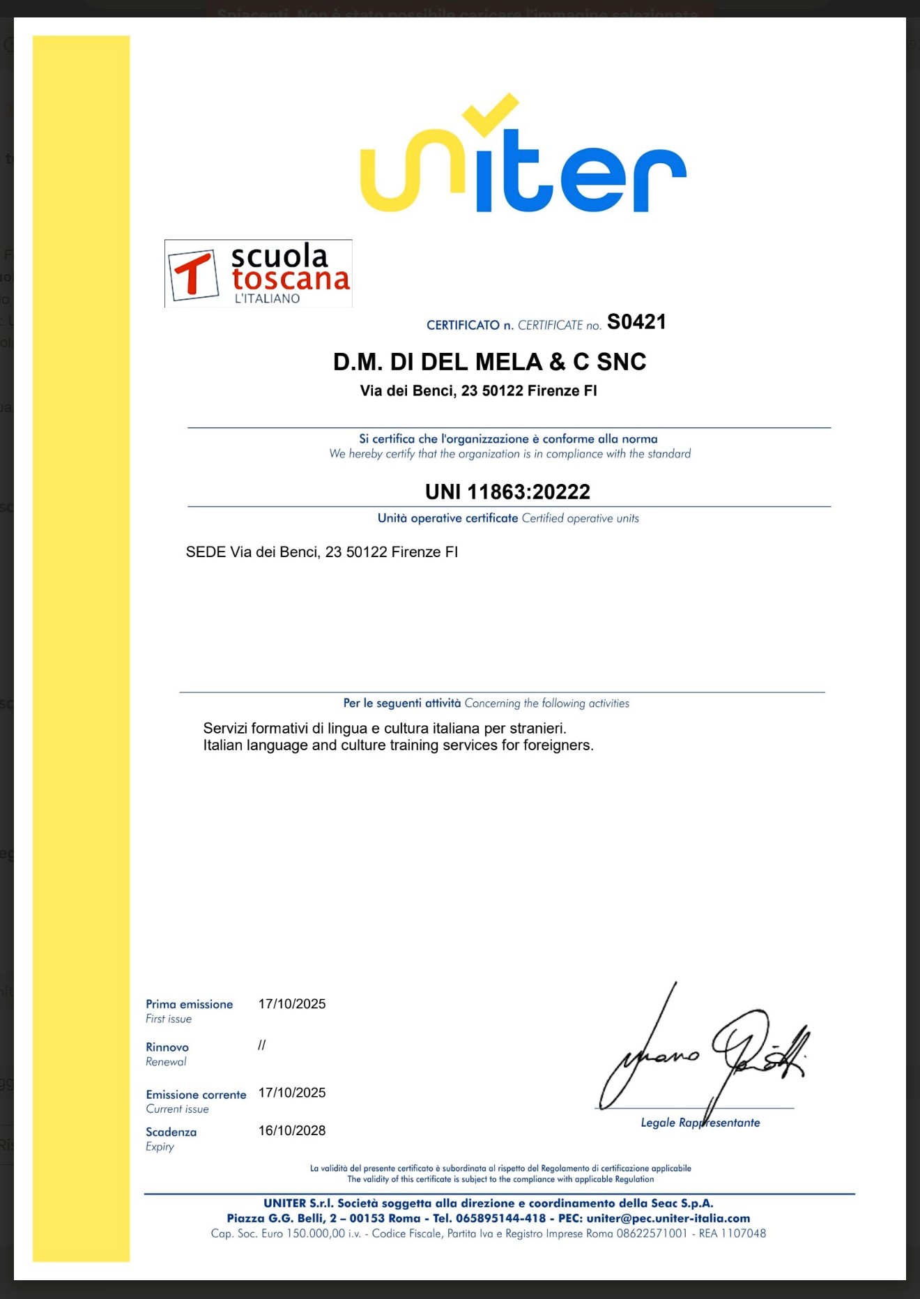 scuolatoscana は、イタリア国内外を問わずさまざまな認定を受けた語学学校であり、数多くの機関とパートナーシップを結んでいます。それは当校の信頼性と質の良いサービスの保証を示しています。
